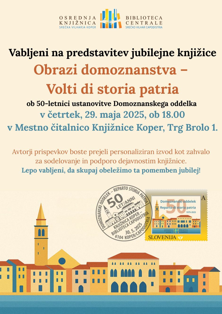 Ob jubilejni petdesetletnici Oddelka za domoznanstvo in knjižno dediščino Osrednje knjižnice Srečka Vilharja Koper je nastala knjižica Obrazi domoznanstva – Volti di storia patria, ki ni le zbornik, temveč zbirka osebnih pričevanj in doživljanj.