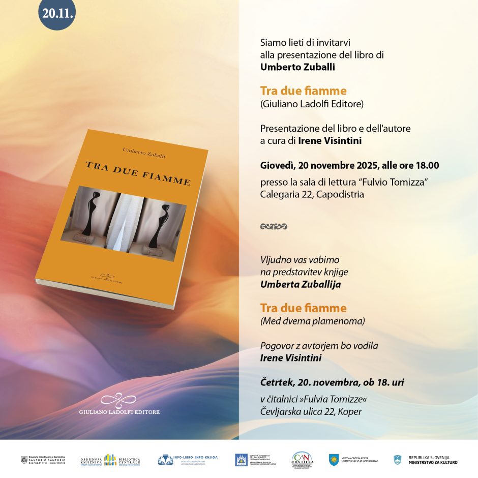V čitalnici Fulvia Tomizze, Čevljarska ulica 22, Koper bomo v četrtek, 20. novembra 2025, ob 18. uri predstavili knjigo italijanskega pisatelja Umberta Zuballija Tra due fiamme (Med dvema plamenoma).