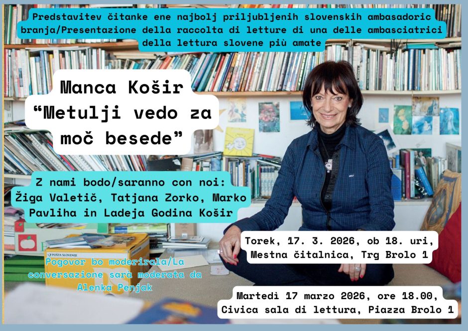 V torek, 17. marca 2026, vas ob 18. uri vabimo v Mestno čitalnico, kjer bomo predstavili čitanko izbranih esejev, kolumn, spremnih besed, člankov in zapisov o knjigah , ki jih je napisala dr. Manca Košir in nosi naslov “Metulji vedo za moč besede” (Mladinska knjiga, 2026).